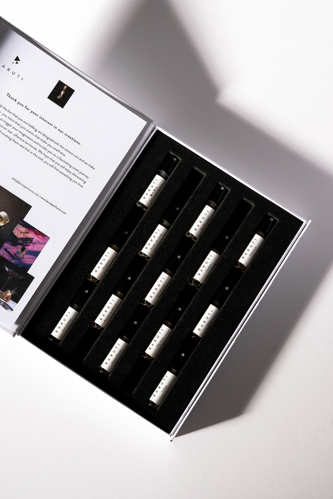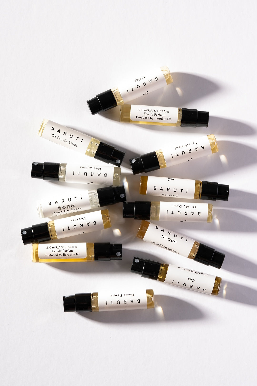 13 x 2 ml tuoksua: Berliini talvella, Chai, NOOUD, Dama Koupa, Perverso, Oh My Deer!, Indigo, Voyance, Onder de Linde, Tindrer, Laurakimou!, Mono No Aware, Hot Cotton